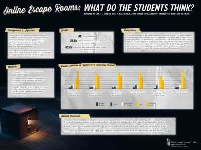 Conclusions: Overall the response to the escape room game was very positive. The main challenge students reported was in navigating the game materials, which were in two different web applications. The workflow was simplified for future iterations based on this feedback. Students expressed appreciation for the interactivity of the game, which gave them a chance to explore the resources. The results of this study suggest that students perceive the escape room format to be an effective learning method. Future research is needed to evaluate the learning outcomes of this approach.